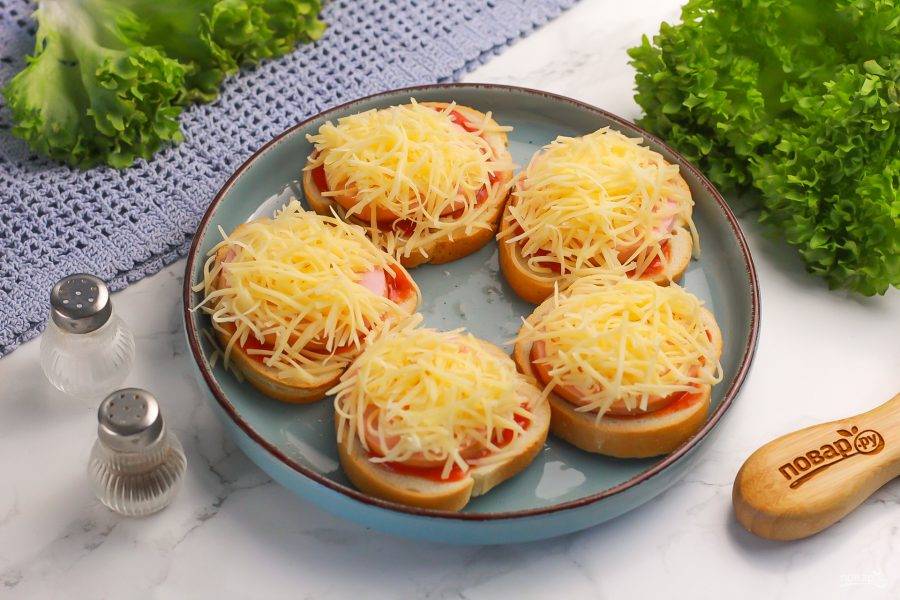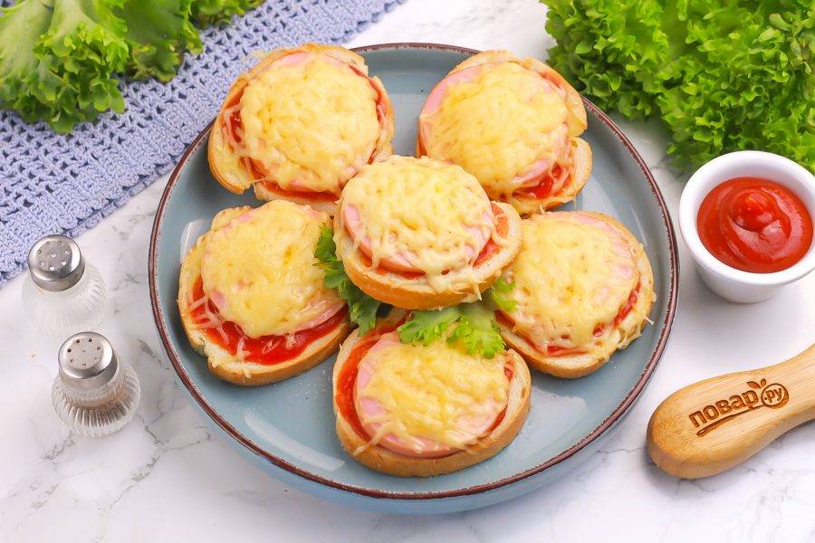 Выложите горячие бутерброды на тарелку и сразу же подайте к столу, пока сырная корочка не остыла и тянется. Приятного вам аппетита!