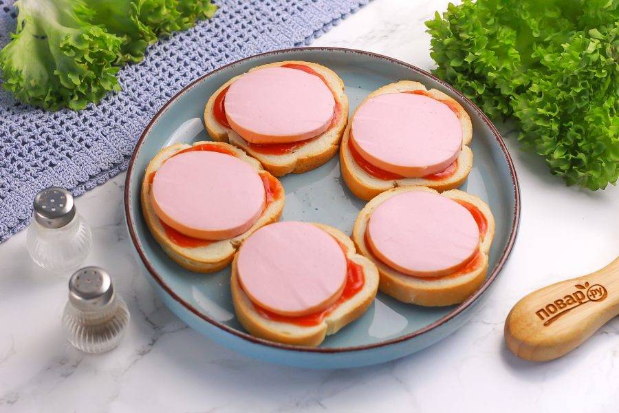 Снимите оболочку с вареной колбасы и нарежьте колбасу кружочками. Можно заменить ее копченой колбасой или отварным мясом. Выложите на кетчуп.