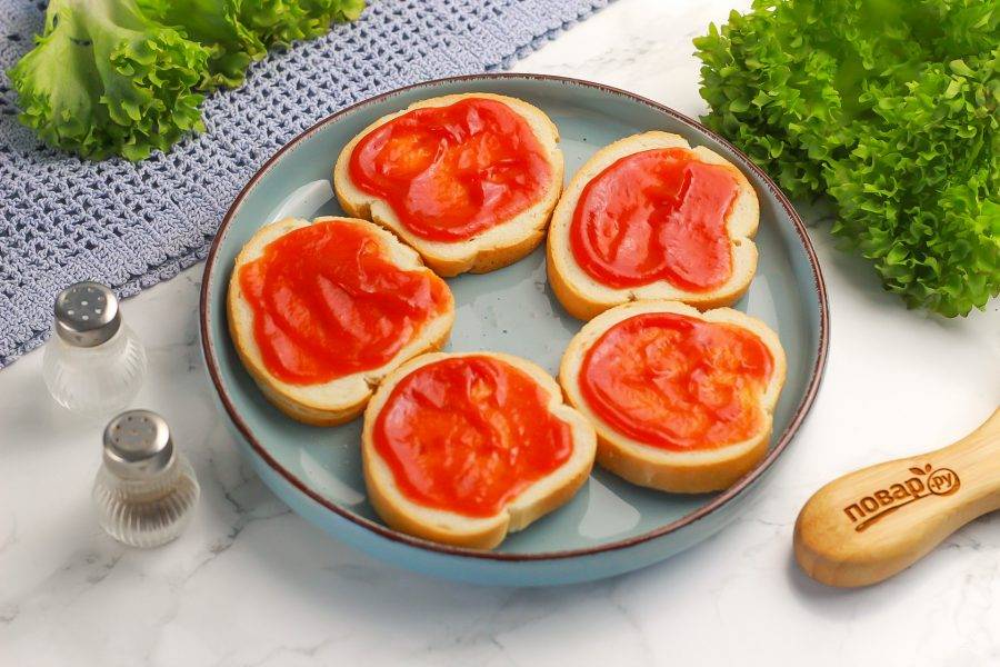 Выложите ломтики хлеба в тарелку или сразу на поддон аэрогриля. Если ломтики крупные, то разрежьте их пополам. Смажьте кетчупом или другим соусом по вашему вкусу.