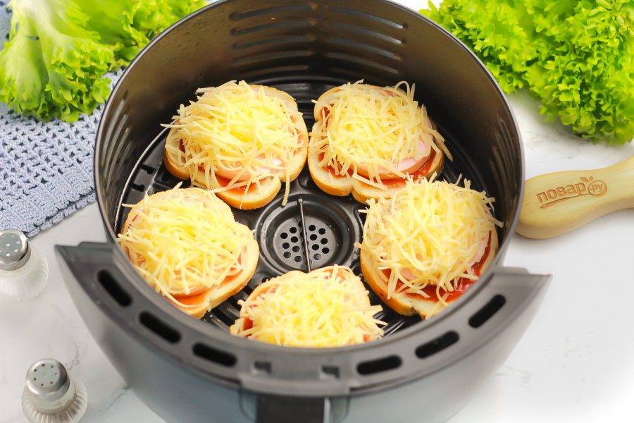 Запеките бутерброды в аэрогриле примерно 5-7 минут при температуре 160 градусов до расплавления сыра.