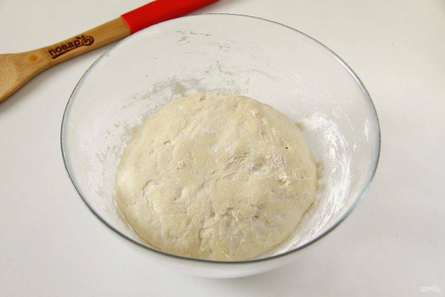 Замесите мягкое, немного липкое тесто. Соберите тесто в шар, присыпьте со всех сторон мукой, накройте миску полотенцем и уберите в теплое место примерно на час.