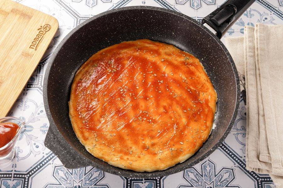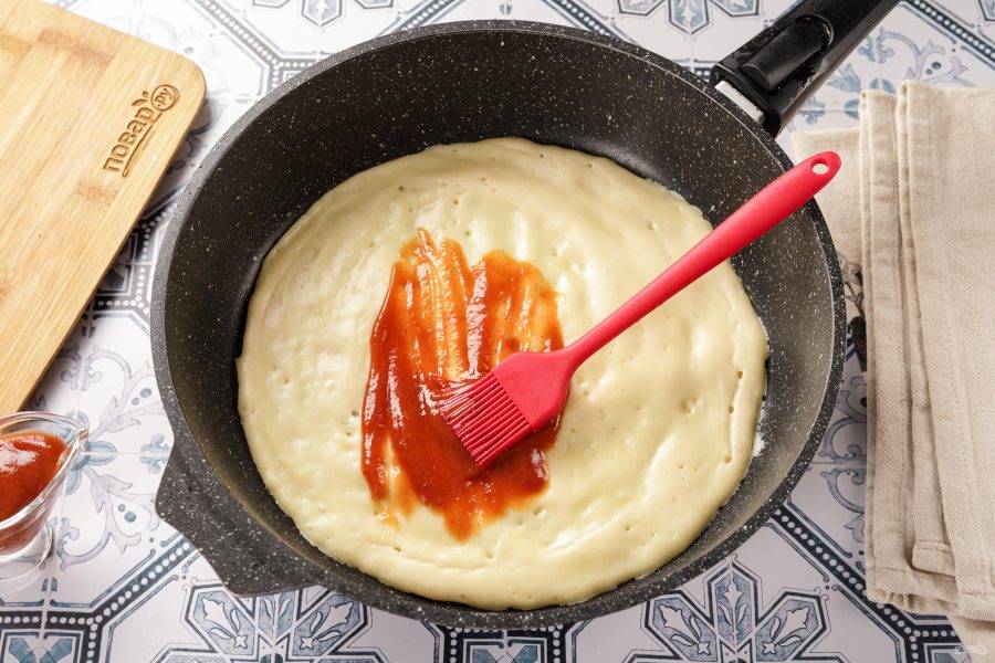 Как только тесто сверху схватится, смажьте его кетчупом или любимым соусом по вкусу.