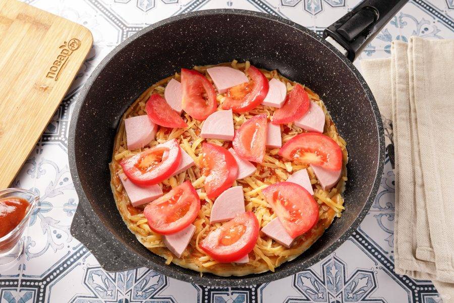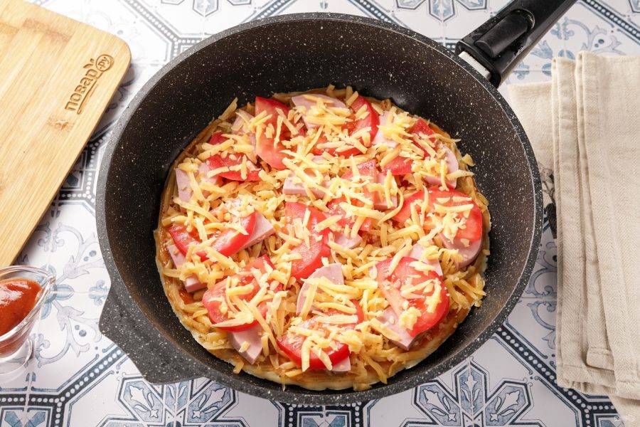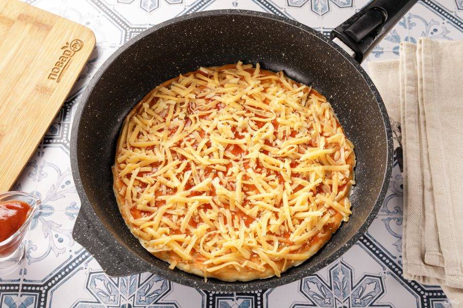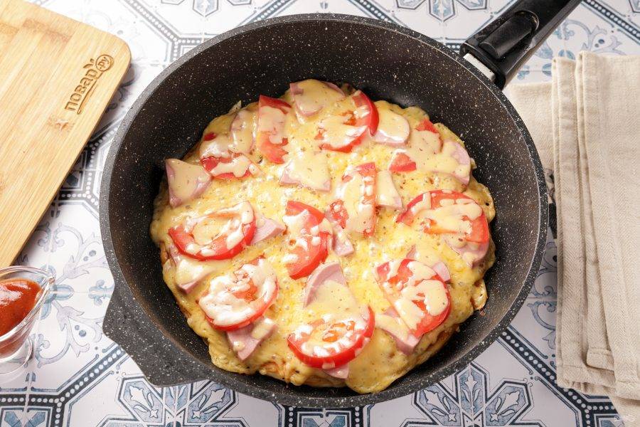 Я ориентируюсь по сыру (он должен хорошо расплавиться) и по румяному низу, главное — не пересушите. Если у вас сковорода небольшая, то возможно уйдёт чуть-чуть больше времени, так как тесто будет толще.