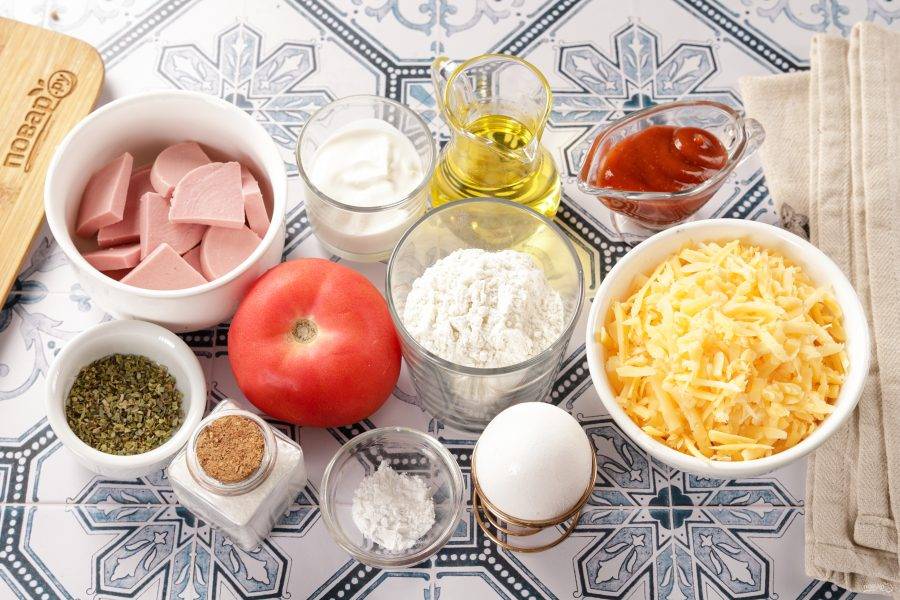 Подготовьте все ингредиенты для пиццы. Сыр натрите на крупной тёрке. Сразу же подготовьте начинку.