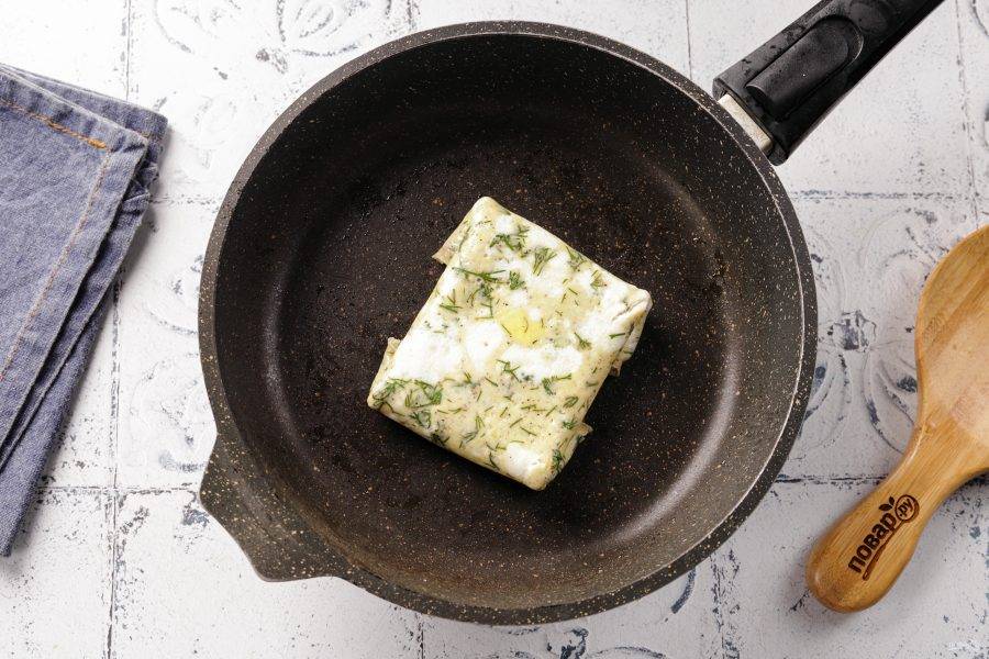 Затем таким же образом подверните верхний и нижний края блинчика. Слегка прижимая лопаткой, обжарьте получившийся конвертик ещё 20-30 секунд. Я конвертик перевернула.