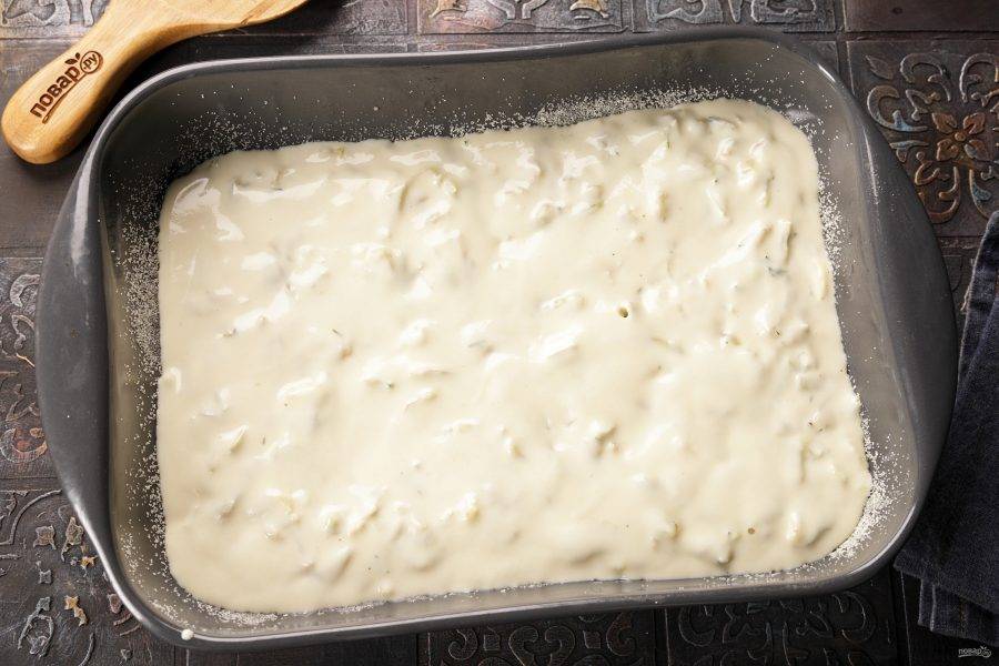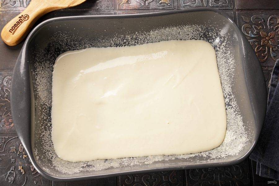 Жаропрочную глубокую форму смажьте маслом. Дно и бока присыпьте мукой или манкой. Вылейте половину подготовленного теста в форму и лопаткой или ложкой аккуратно распределите по всей форме ровным слоем.