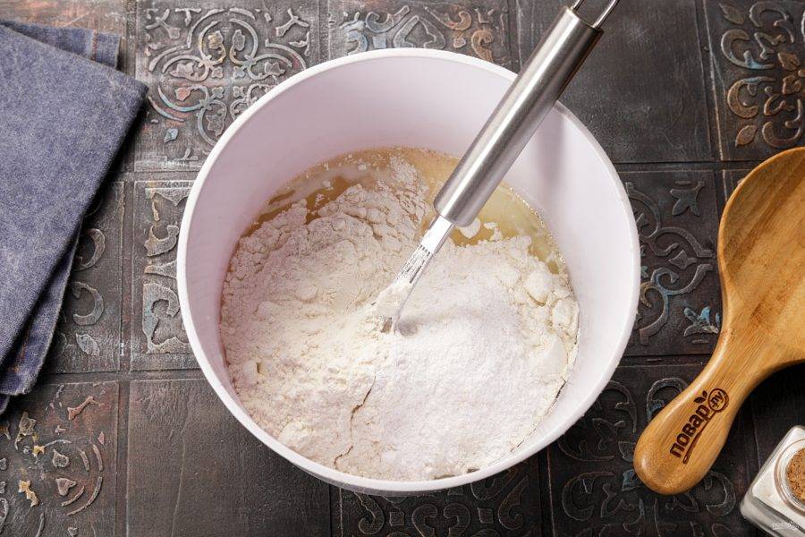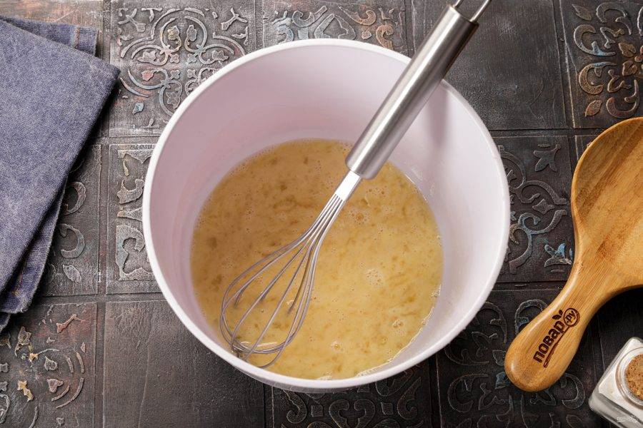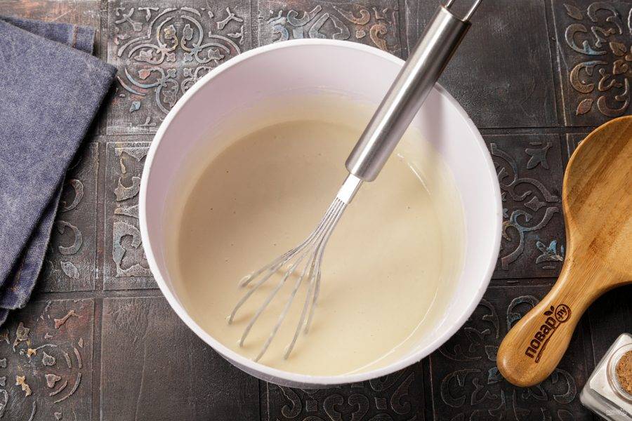Перемешайте до однородности, чтобы не было комочков. Заливное тесто должно быть гладким, но не густым, а тягучим, как на оладьи.