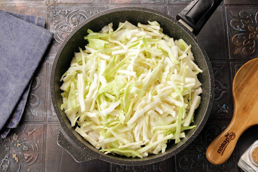 Капусту очистите от верхних листьев, промойте. Нарежьте короткой тонкой соломкой и выложите на разогретую сковороду с маслом.