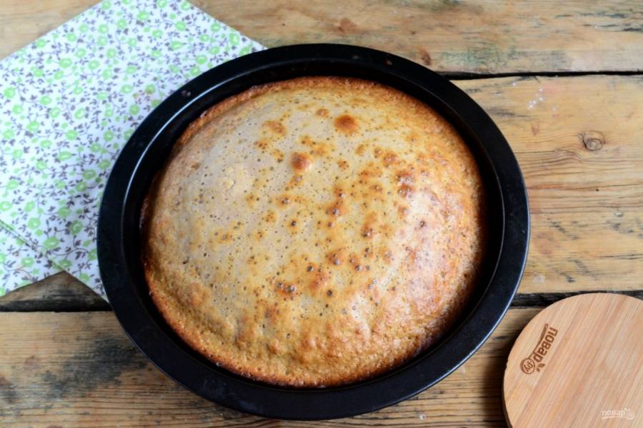 Ставьте пирог в заранее разогретую до 180 градусов духовку на 25 минут. Готовность пирога проверяйте спичкой: просто воткните ее в пирог, если она останется сухой, значит пирог готов и его можно вынимать из духовки.