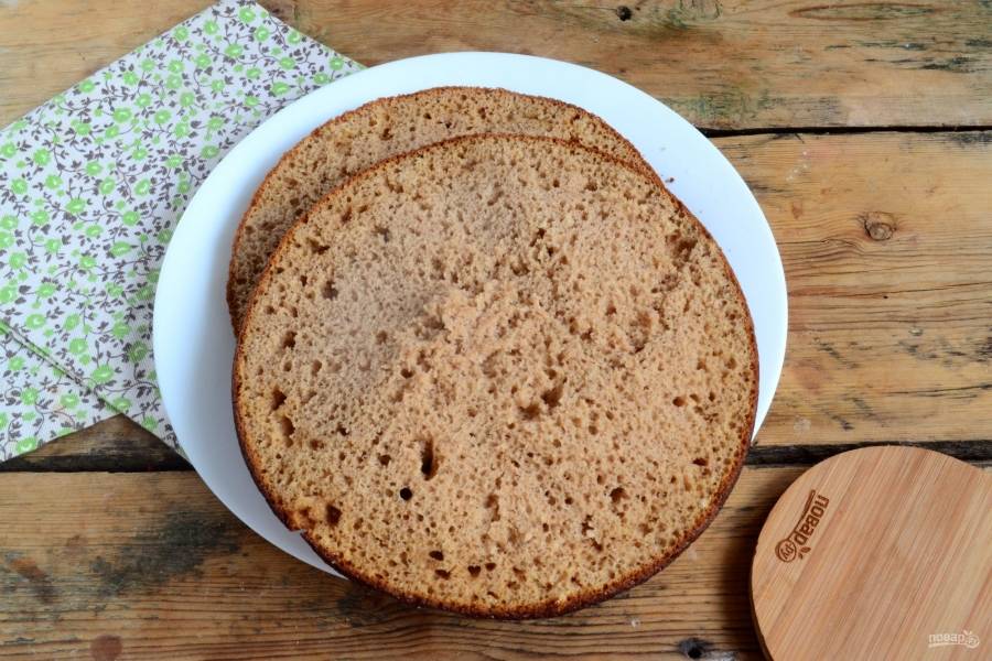 Дайте коржу слегка остыть, а затем разрежьте его на две части.