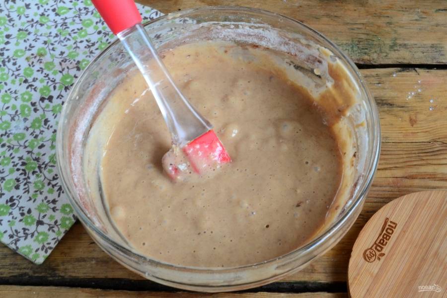 Взбейте 2 яйца до посветления массы и увеличения ее в объеме в 3 раза. Затем добавьте сгущенное молоко, немного соды и какао. В последнюю очередь всыпьте муку и перемешайте полученную массу.