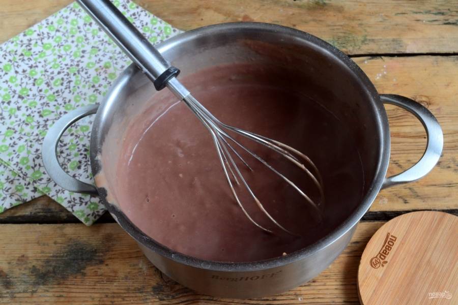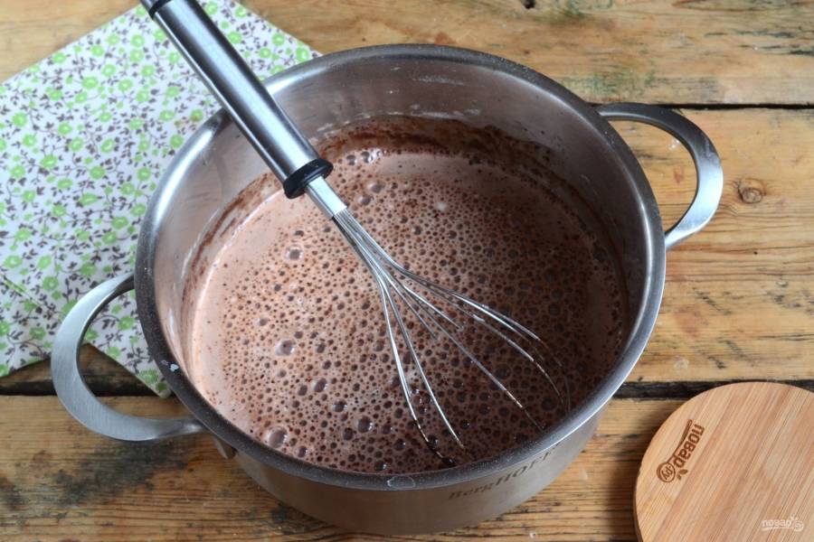 Всыпьте необходимое количество какао, хорошенько перемешайте и поставьте на медленный огонь. Постоянно помешивайте венчиком, пока масса не загустеет.