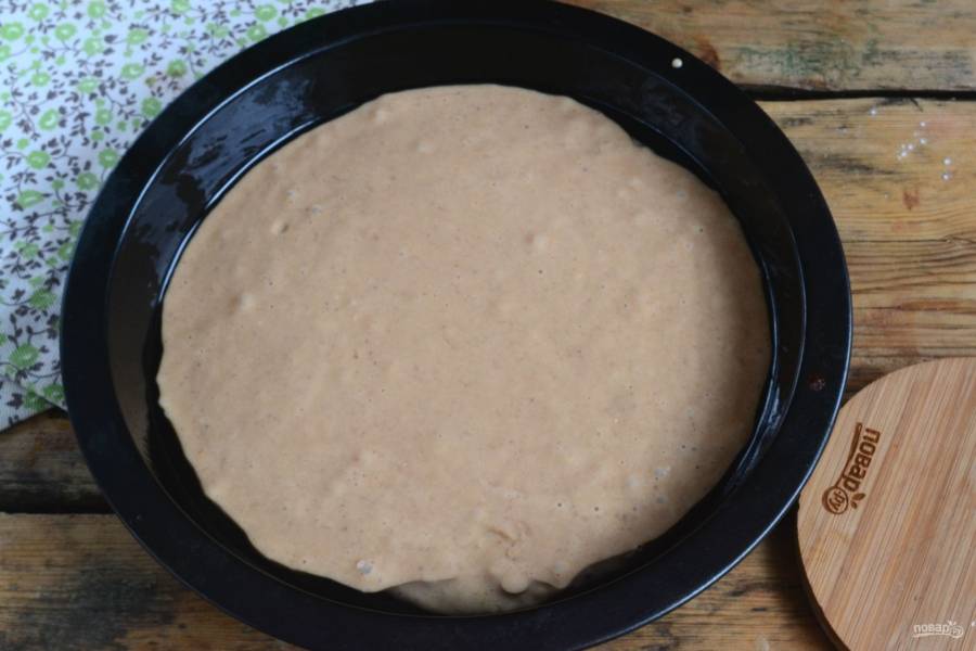 Вылейте тесто в круглую форму (диаметр 21-23 см.), смазанную сливочным или растительным маслом.