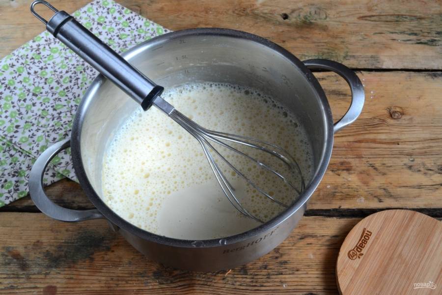 Приготовьте крем. Для этого смешайте яйцо с сахаром, добавьте муку и молоко. Перемешайте.