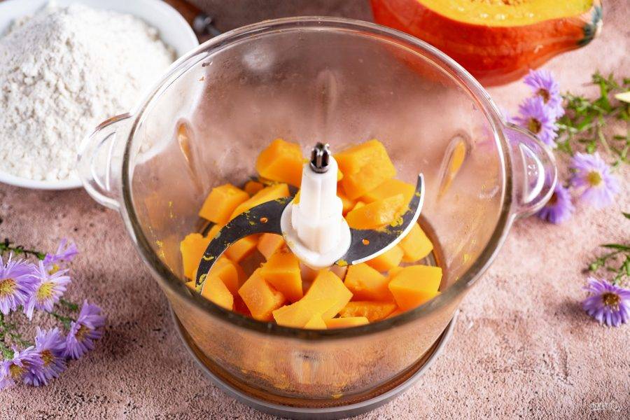 Отваренные кусочки тыквы с небольшим количеством отвара (2-3 ст.л.) выложите в чашу блендера и измельчите до получения однородного пюре.