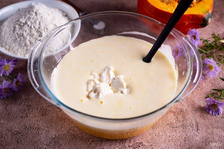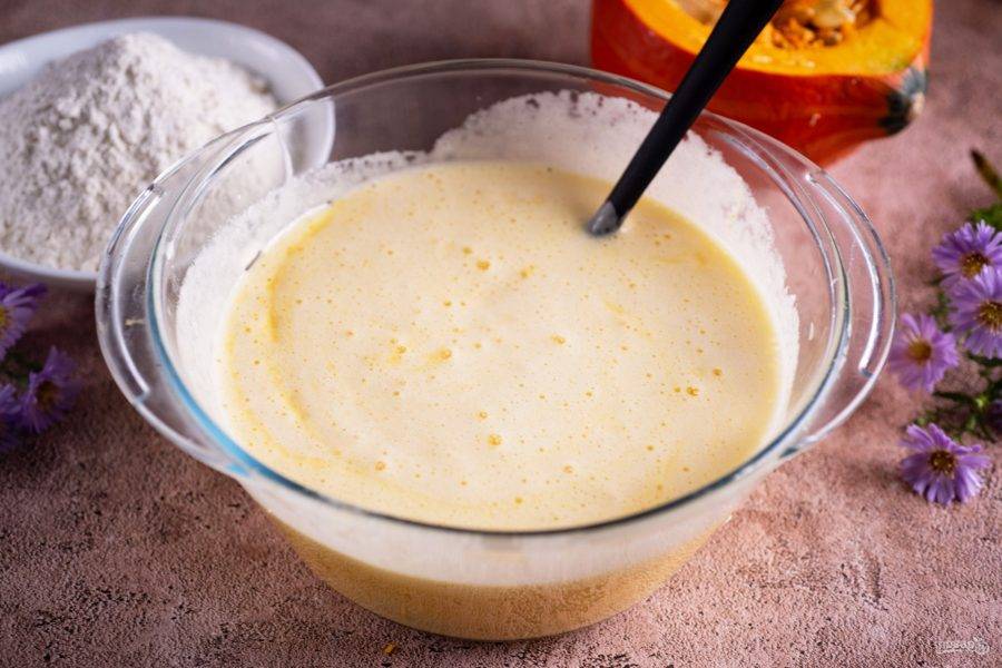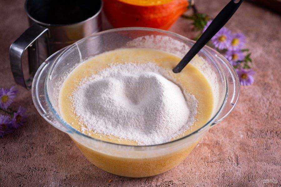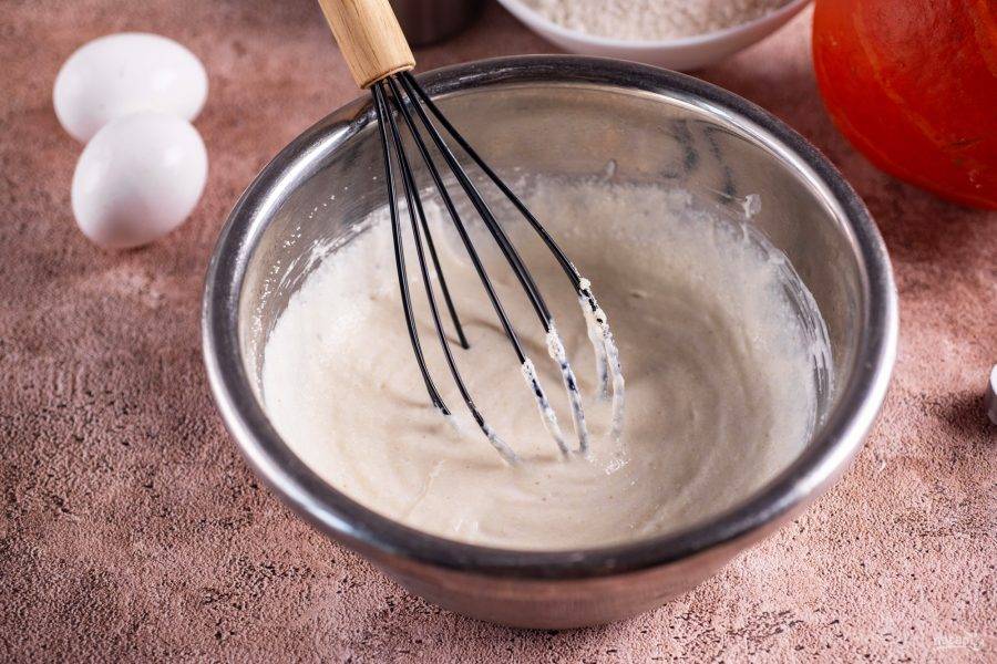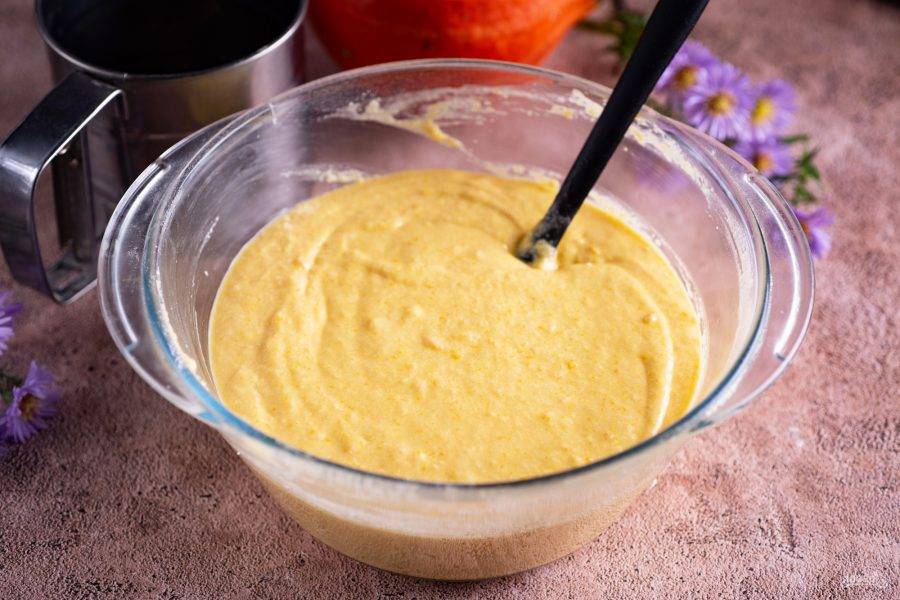 Вмешайте ее до получения однородного густого, вязкого теста, которое с ложки медленно падает лентой.