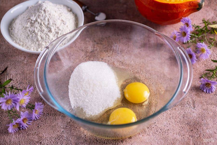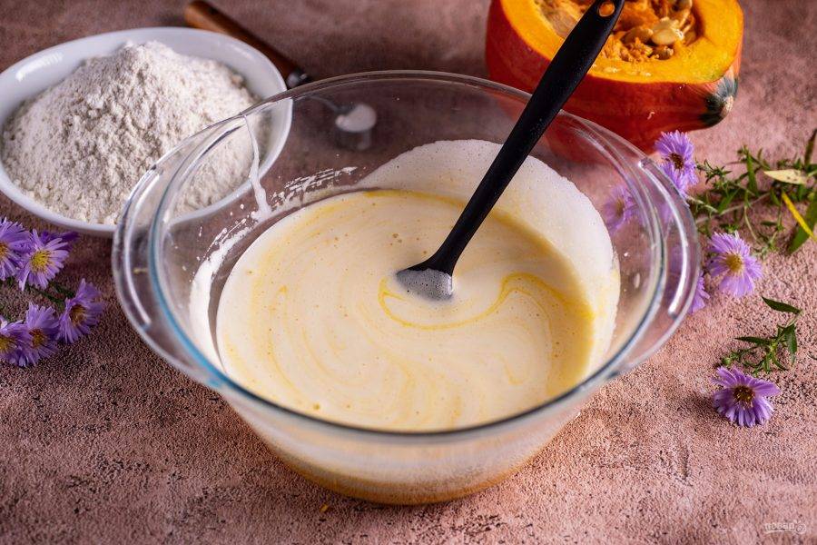 Добавьте тыквенное пюре в миску ко взбитым яйцам. Перемешайте лопаткой.