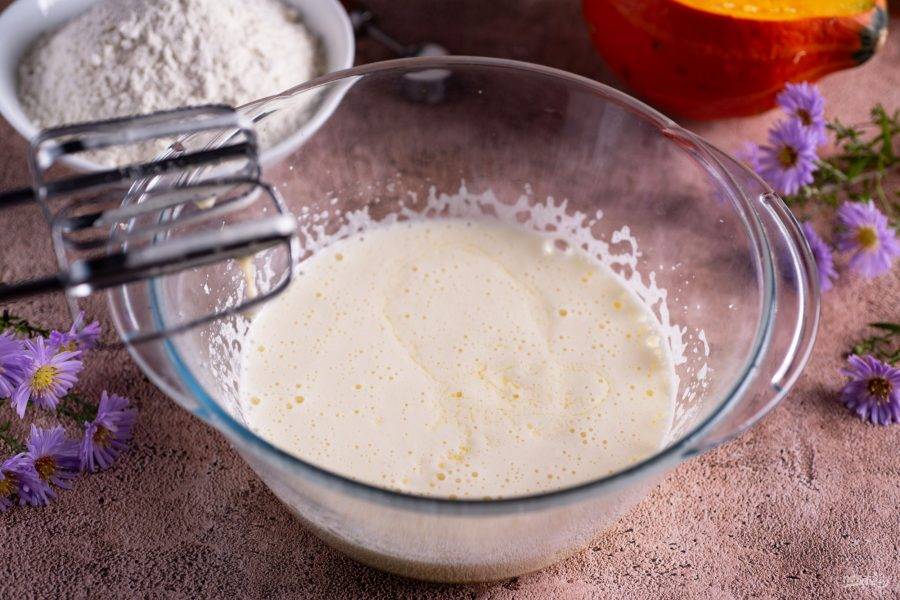 Взбейте миксером яйца с сахаром до получения пышной, светлой смеси, залейте к этой смеси растопленное сливочное масло и еще раз взбейте.