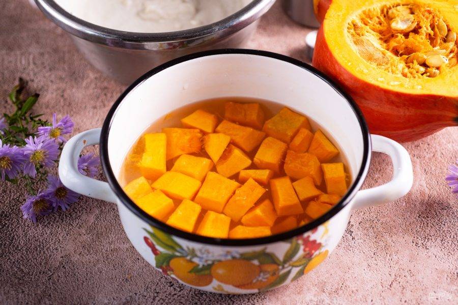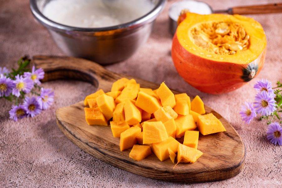 Очистите кусочек тыквы от кожуры и семян и отмерьте необходимое количество мякоти (150 грамм). Нарежьте тыкву небольшими кубиками.