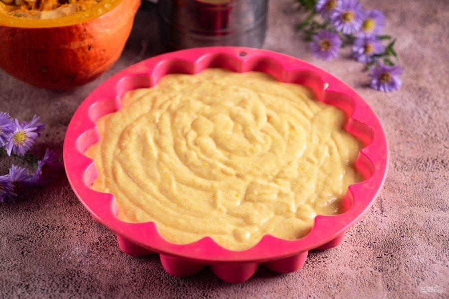 Выложите все тесто в форму. У меня форма силиконовая, поэтому я ее ни чем не смазываю и не выстилаю пергаментом. Выпекайте пирог в заранее разогретой до 180 градусов духовке 40-45 минут.