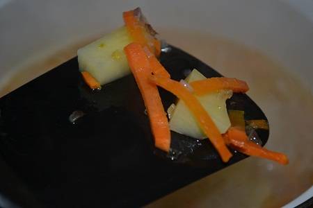 Нарезаем кубиком лук, соломкой морковь и обжариваем на сковороде до прозрачности лука. Готовые овощи выкладываем в кастрюлю.