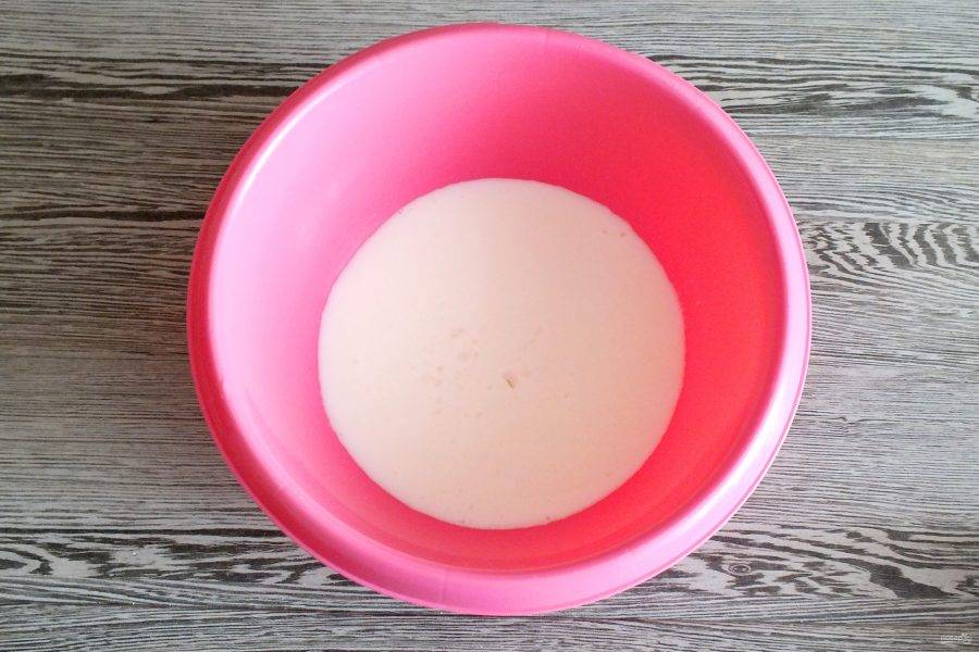 Влейте кефир комнатной температуры в чашу. Добавьте соду. Оставьте на 6-8 минут.