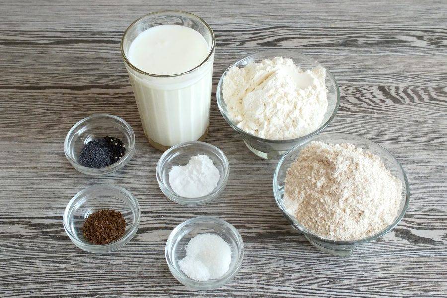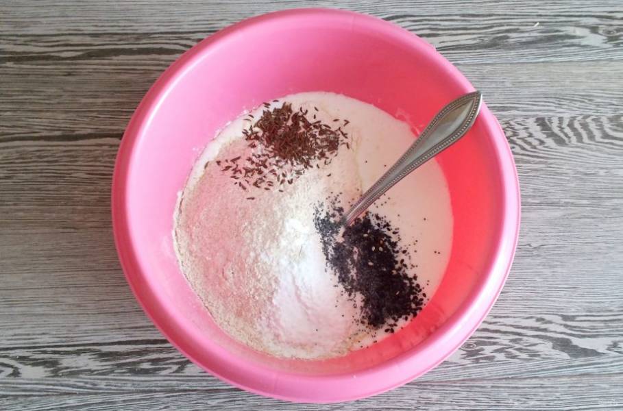 По истечении времени добавьте просеянные оба вида муки, соль, сахар, разрыхлитель для теста и семечки.