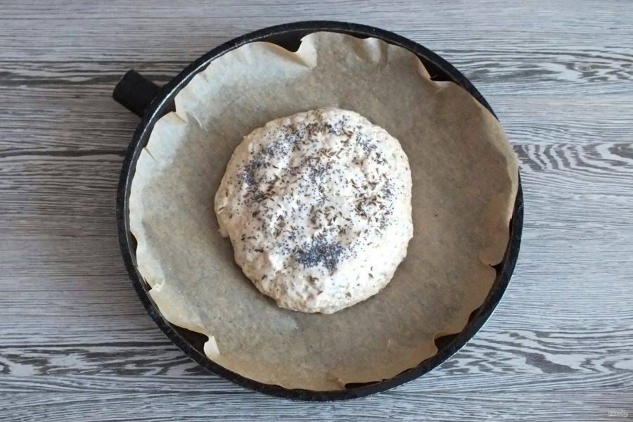 Форму или сковороду застелите пергаментом. Смочите хорошо руки водой. Достаньте тесто из чаши. Не опуская на рабочую поверхность, в руках, сформуйте округлый хлеб. Переложите в форму. Сверху присыпьте семечками или злаками, по желанию. Поставьте в разогретую до 180 градусов духовку на 25-35 минут. Учитывайте особенности своей духовки.