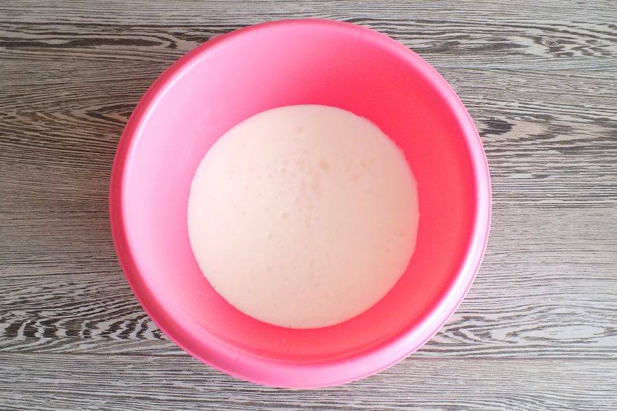 В чашу налейте кефир, добавьте соду. Перемешайте. Оставьте на 10 минут.