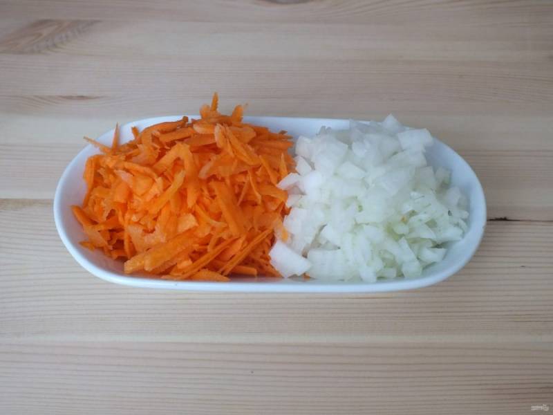 Морковь натрите на крупной терке. Лук нарежьте мелким кубиком.