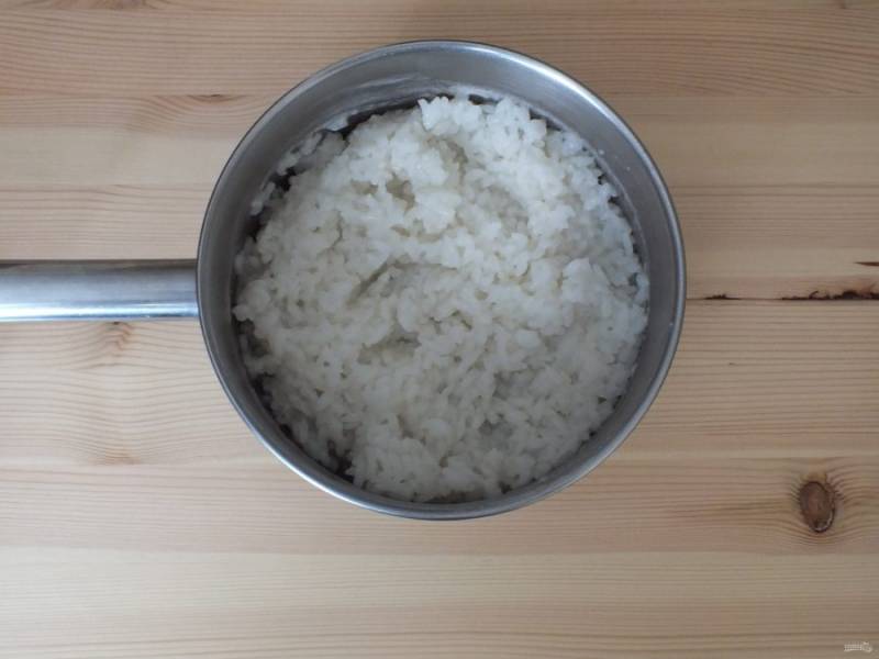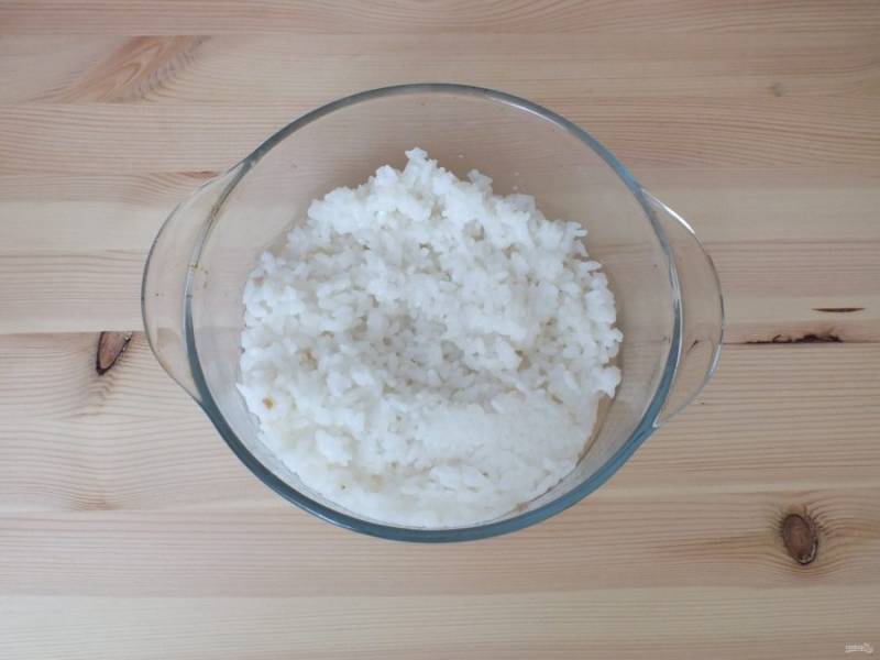 Готовый рис откиньте на дуршлаг, промойте. Переложите в глубокую чашу.