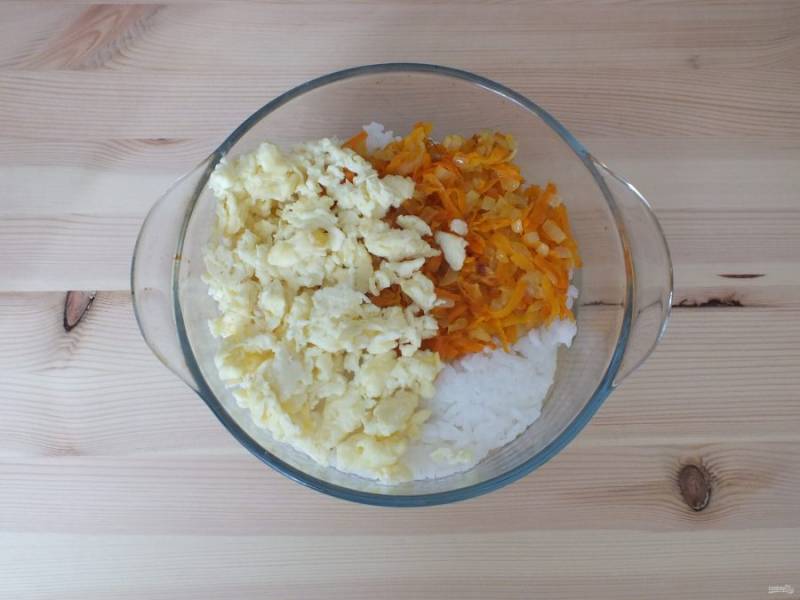 Обжаренные лук, морковь и омлет добавьте к рису.