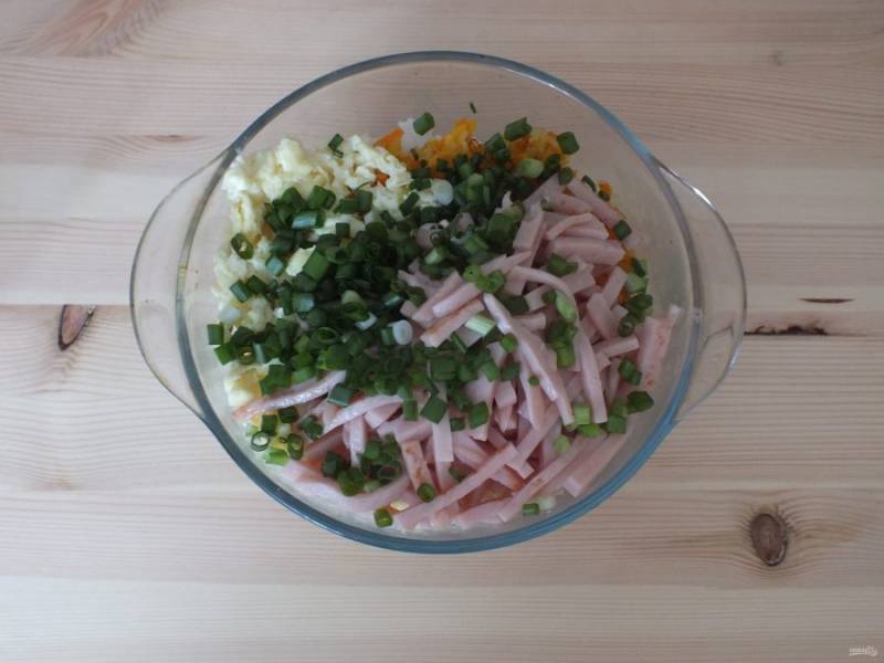 Добавьте ветчину и нарезанный зеленый лук к рису.