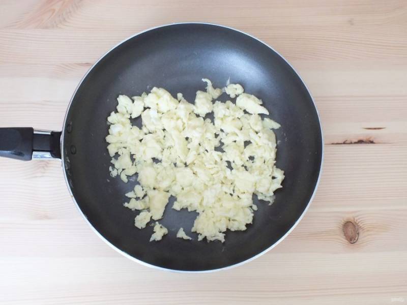 На большом огне, в небольшом количестве растительного масла, поджарьте омлет, постоянно перемешивая, не давая ему зажариться.