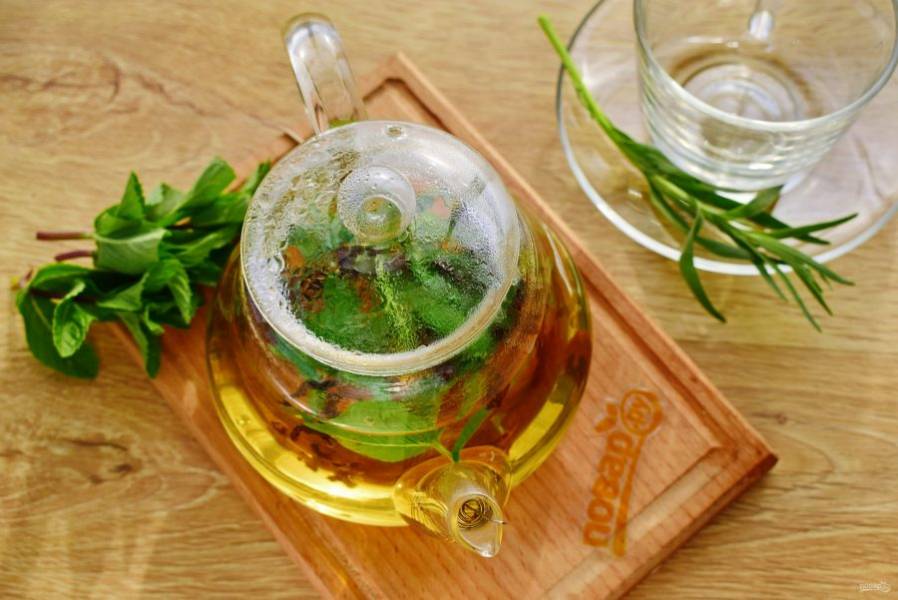Чайник ополосните кипятком. Мяту и тархун (эстрагон) сполосните холодной водой. Заложите травы и чай (1 ч.л.) в заварочный чайник.