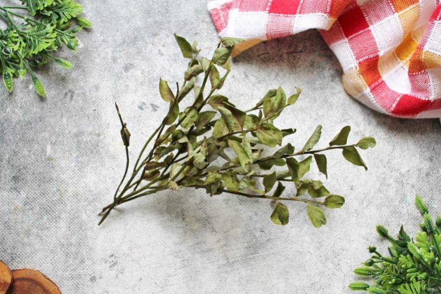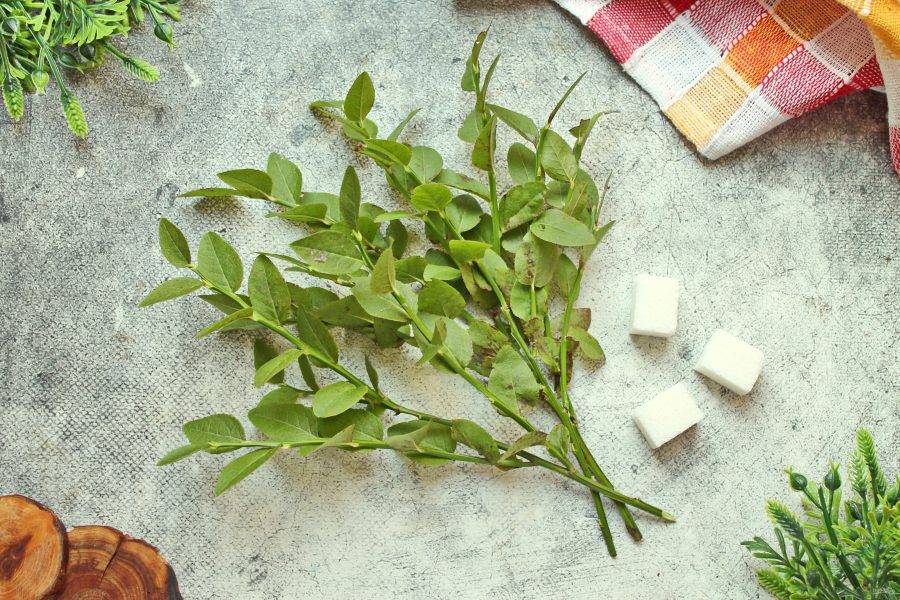 Подготовьте все необходимые ингредиенты для приготовления чая из листьев черники. Веточки сполосните, отряхните.