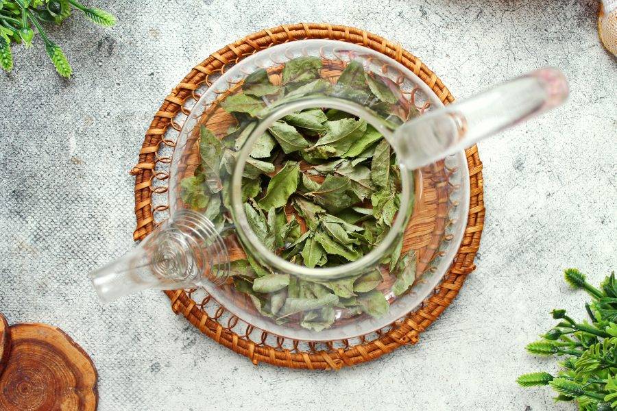 Оборвите листики с веточек и выложите их в заварочный чайник.