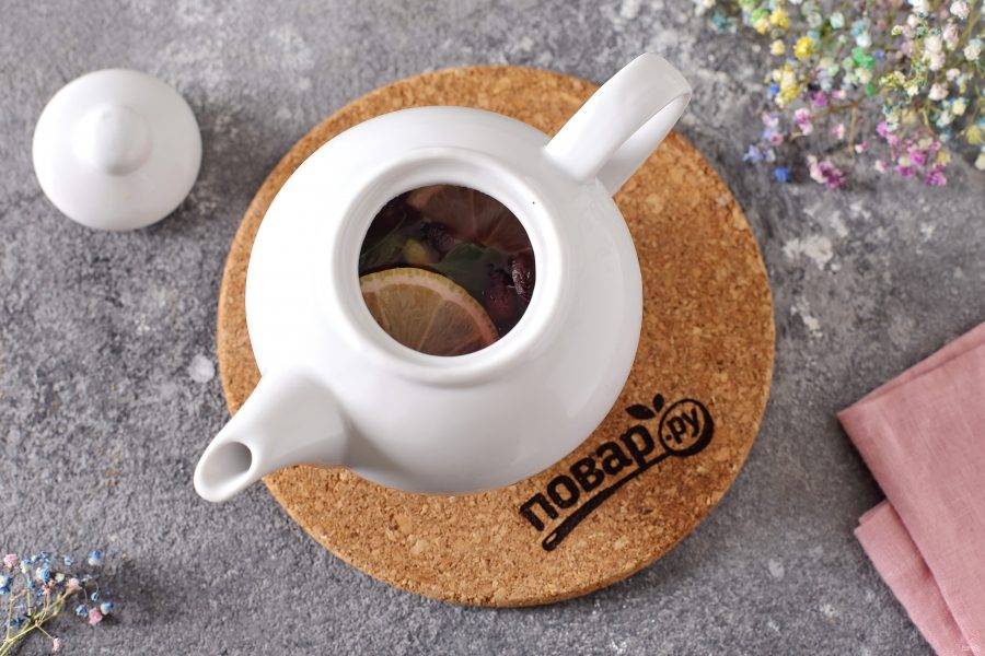 Заварите ягоды, мяту и лимон в кипятке и дайте настояться в чайнике или термосе 10 минут.
