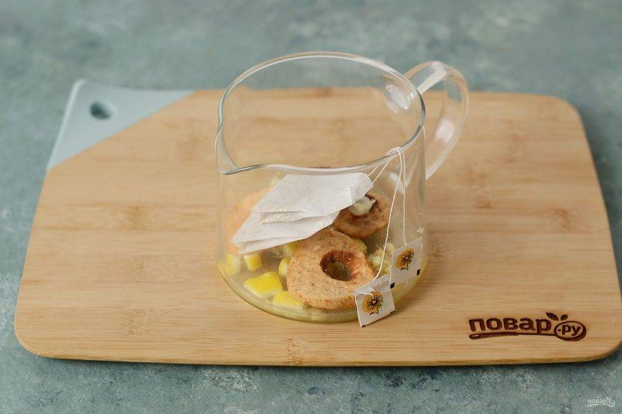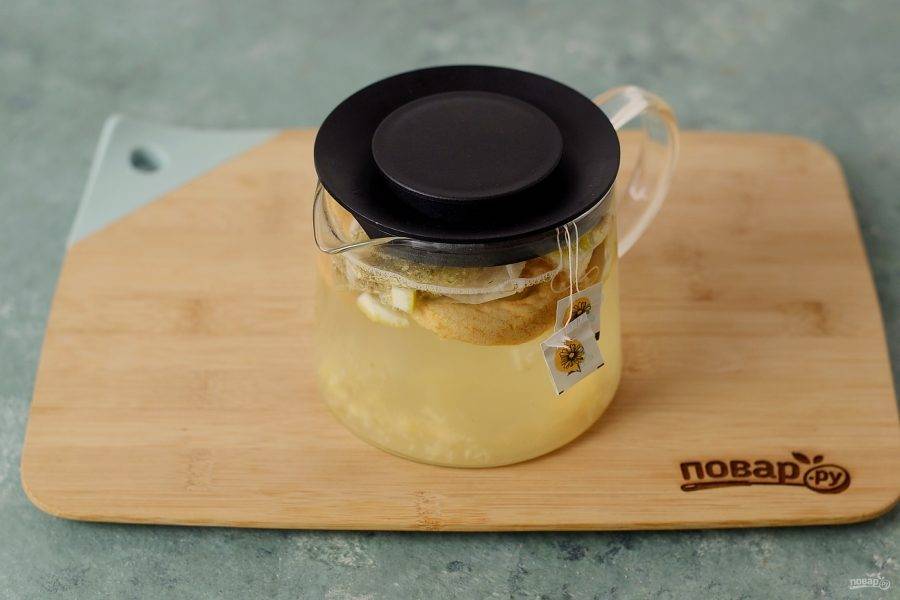Выложите в заварочный чайник лимон, имбирь и сушеные яблоки. Добавьте сушеную ромашку.