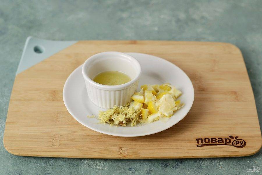 Имбирь натрите на мелкой терке. Из лимона выжмите сок, затем нарежьте мякоть кубиками.