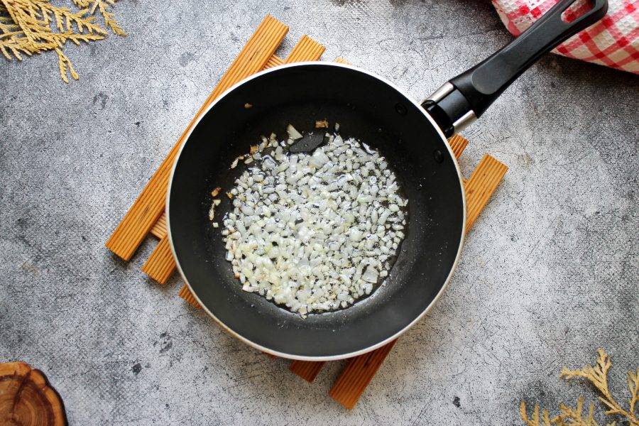 Репчатый лук мелко порежьте и обжаривайте на сковороде с растительным маслом на среднем огне 5-6 минут.