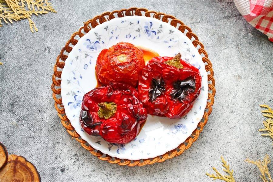 Болгарский перец и помидор выложите на противень и запекайте при температуре 200 градусов в течение 20-30 минут. Овощи остудите и удалите шкурку, мелко порежьте.