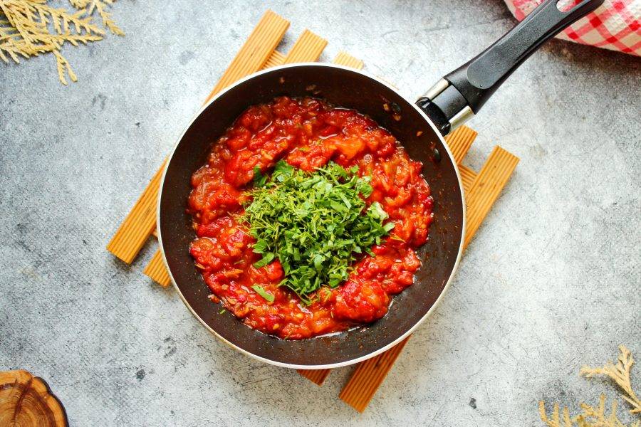 Добавьте порезанные помидоры и тушите еще 3 минуты.