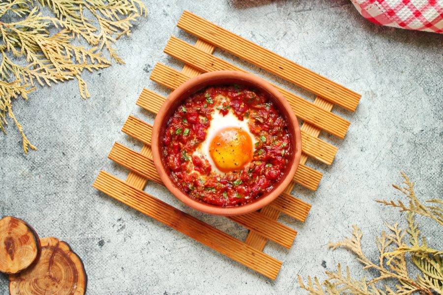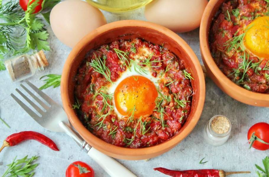 Поставьте чакчуку в горячую духовку и запекайте при температуре 180 градусов в течение 10-15 минут, до желаемой консистенции желтка. Готовую чакчуку достаньте и сразу подавайте к столу.