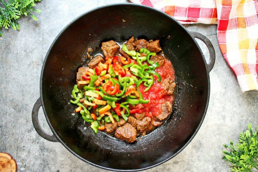 Сладкий перец порежьте крупной соломкой, острый перец измельчите. Добавьте их к мясу с помидорами.