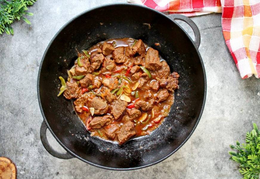 Все перемешайте, убавьте огонь и влейте горячую воду. Закройте казан крышкой и тушите мясо в течение 1-1.5 часов.