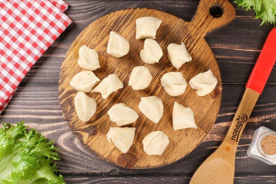 Тесто раскатайте "колбаской" и нарежьте небольшими кусочками, размер которых зависит от желаемого размера готовых изделий.