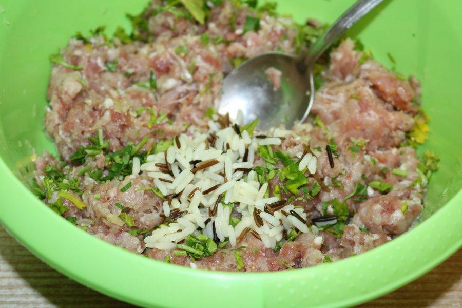 Рис отварите, добавьте в фарш.