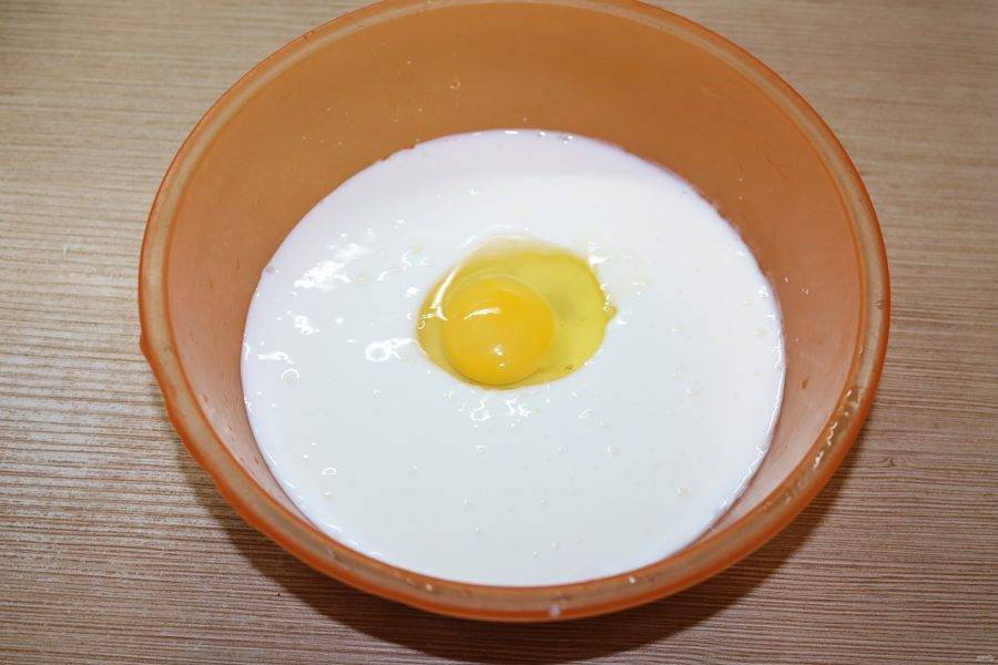 Приготовьте тесто. В кефир добавьте яйцо, щепотку соли и небольшими порциями муку.