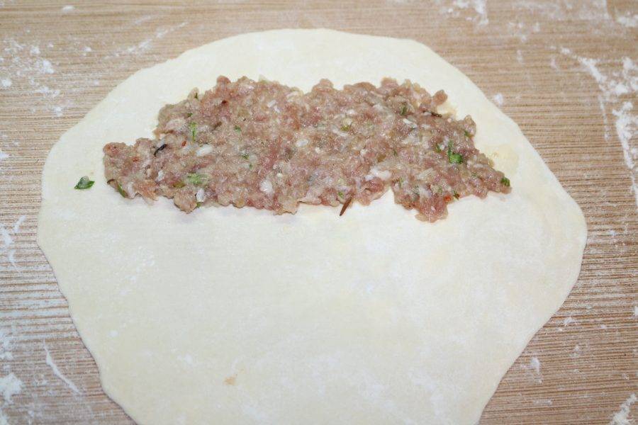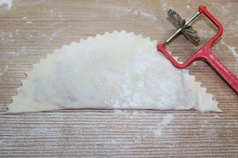 Кусочек теста тонко раскатайте, слегка присыпав мукой. На одну половину выложите 1-1.5 ст. л. начинки.
